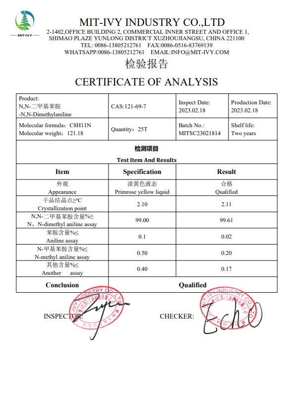| Product:N-二甲基苯胺-N,N-Dimethylaniline | CAS:121-69-7 | Inspect Date:2024.07.07 | Production Date:2024.07.07 |