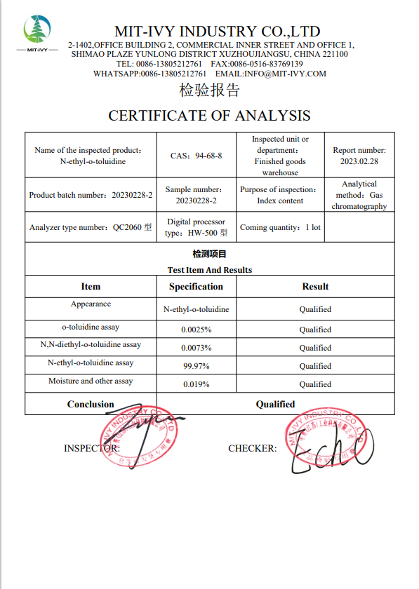 | Product:N-乙基邻甲苯胺-N-Ethyl-o-toluidine | CAS:94-68-8 | Inspect Date:2024.07.07 | Production Date:2024.07.07 |