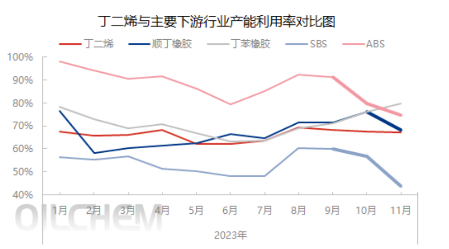 Affected by the continuous pressure on downstream profits, the capacity utilization rate of butadiene’s main downstream industries has gradually decreased. The capacity utilization rate of butadiene rubber in November was estimated at 68.23%, down 7.82 percentage points from the previous month. SBS industry capacity utilization rate in 43.86%, down 12.97 percentage points; The capacity utilization rate of ABS industry was 74.90%, down 4.80 percentage points from the previous month, while maintaining the downward trend since August.