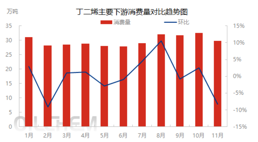 Due to the pressure on the main downstream profits of butadiene, and the gradual decline in the capacity utilization rate of the industry, the consumption of raw material butadiene in the downstream industry has decreased. In November, butadiene consumption in the main downstream industry was estimated at 298,700 tons, down 8.29% from the previous month.