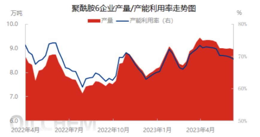 Recently, the PA6 polymerization load is basically maintained near 70%, and the overall start-up situation is relatively stable, and the demand in the high-speed spinning field can still support the polymerization start, coupled with some new production capacity and maintenance capacity restart, the polymerization link has certain support for caprolactam demand. However, with the decline in prices of upstream crude oil and pure benzene, as well as the influence of negative factors such as the abundant supply of polymer chips, the market price of PA6 chips is also weakening, especially the continued weak terminal demand for conventional spinning chips, under the abundant supply situation, the inventory of polymerization factories is growing, the shipping pressure of enterprises is still there, and the price is partly falling.