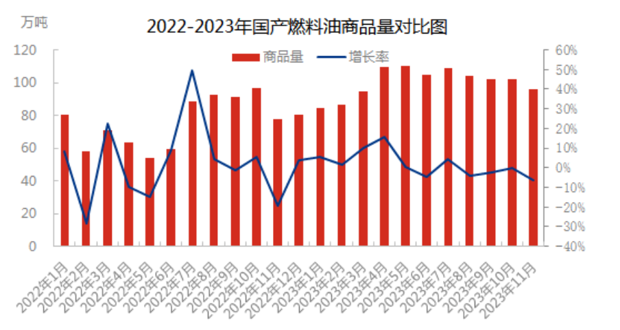 In November 2023, the profit of the refinery was still low, and some of the raw materials of the refinery were tight, and the equipment still had short-term shutdown or negative operation. Domestic fuel oil commodity volume fluctuated down from the previous month. Domestic refinery fuel oil commodity volume in November was 960,400 tons, down 6.10% month-on-month, up 18.02% year-on-year. The domestic fuel oil commodity volume from January to November 2023 was 11,040,500 tons, up 2,710,100 tons, or 32.53%, compared with the same period last year.