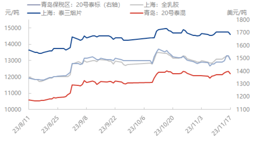 By the fall in international crude oil prices, the atmosphere of the commodity market is empty, and the rubber price is adjusted back after rising. As of November 17, the spot price of natural rubber fell (full latex 13050 yuan/ton, -250/-1.88%; No. 20 Thai standard 1490 US dollars/ton, -30/-1.97%, equivalent to 10687 yuan/ton; No. 20 Thai Mix 12200 yuan/ton, -150/-1.21%).