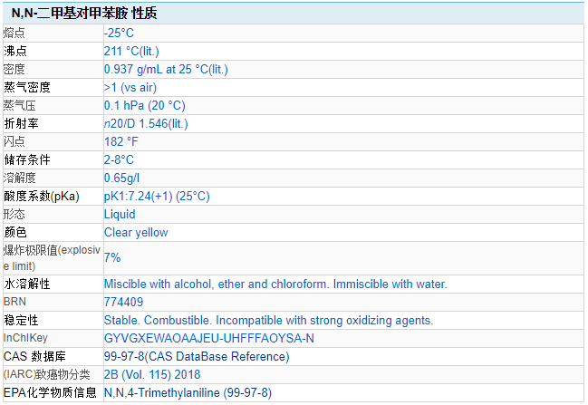 Physical and chemical properties: N,N-dimethyl-p-toluidine is a colorless or light yellow oily liquid with a smell of rotten eggs. It has a melting point of 130.31°C, a boiling point of 211.5-212.5°C Chemicalbook, and a gravity of 0.9287~0.9366g/mL at room temperature. The refractive index is 1.5360~1.5470, insoluble in water, soluble in some organic solvents, and decomposes when exposed to light.