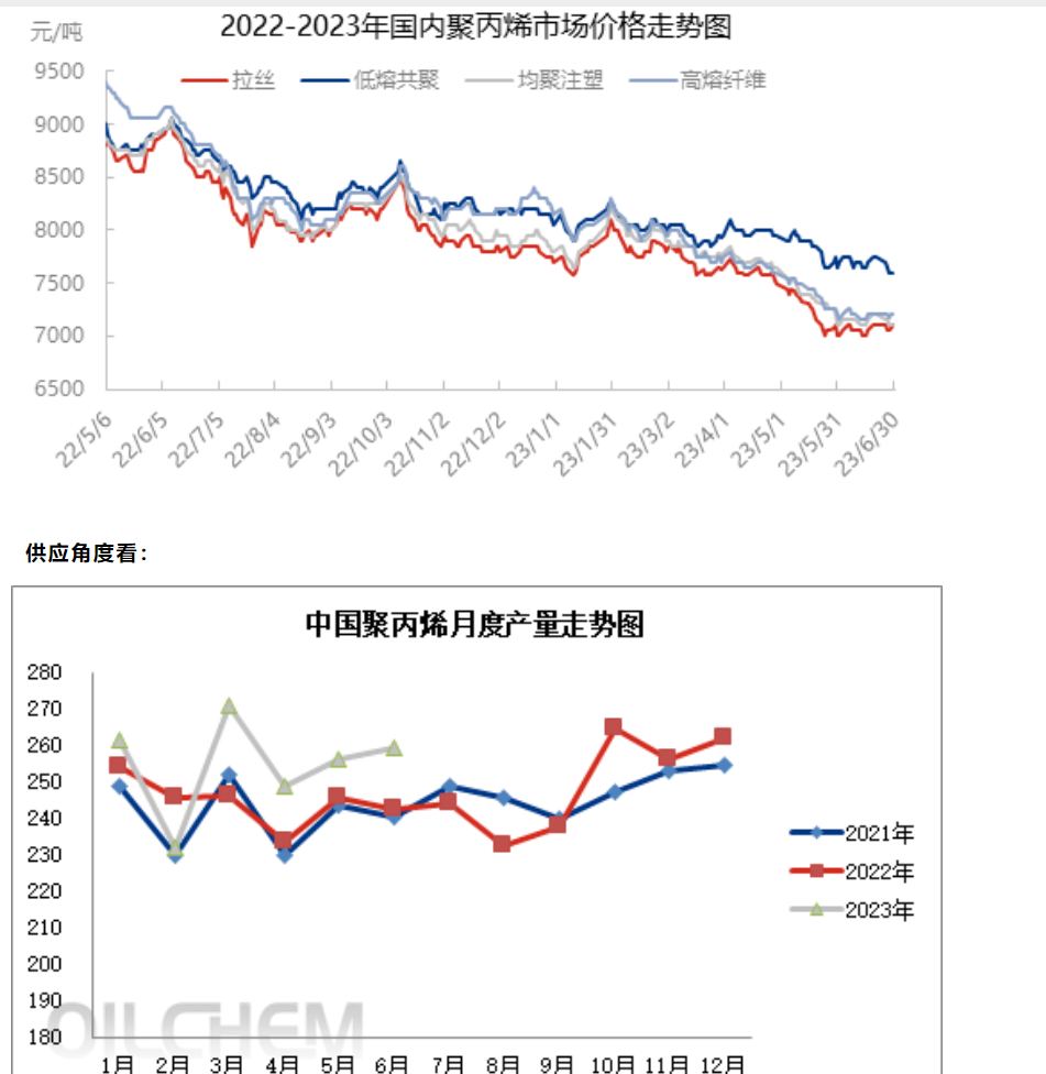 In June, the total output of polypropylene in China was 2,603,800 tons, an increase of 43,100 tons compared with May, +1.68% month-on-month, +7.40% year-on-year. Within the month, the second phase of the giant Zhengyuan officially started mass production, Donghua Maoming continued to postpone, Anqing Petrochemical 300,000 tons/year polypropylene device on the 22nd commissioning test, officially sold in July. With the economic return of some devices, the maintenance devices have been restarted successively, and the market supply has increased slightly from May.