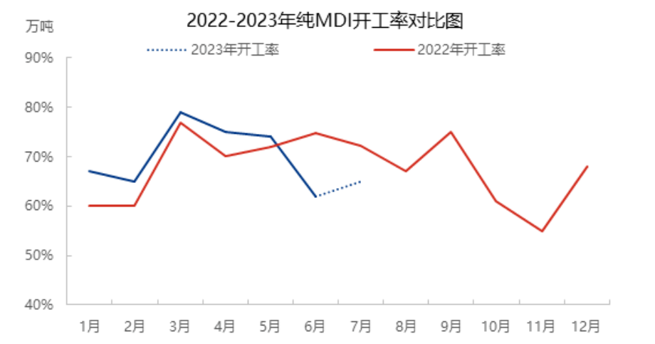 Shanghai Lianheng 35+ 240,000 tons/year mother liquor plant began to be repaired successively from June 11, affecting Shanghai Huntsman and Shanghai BASF rectification plant, and in addition to supporting maintenance, Ningbo phase I 400,000 tons/year plant shutdown maintenance, phase II 800,000 tons/year plant low negative operation, in addition to Fujian plant negative operation, maintain about 50% of the on-load. The 600,000-ton/year unit in Shanghai was reduced due to front-end raw material supply problems. Multiple sets of device maintenance + negative impact, the domestic MDI overall load only maintained about 60%, and since March, the pure MDI overall load continued to decline, and the operating rate in June and July only maintained about 60%.