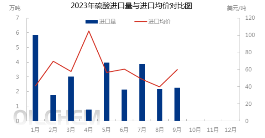In 2023, from January to September, China’s sulfuric acid exports were 1,621,700 tons, 47.55% less than the same period last year. Among them, the export volume in August was the largest, with an export volume of 219,400 tons; The main reason is the sluggish demand in the domestic sulfuric acid market in August, the inventory backlog in the early stage of the acid plant, and the new demand in the international market such as Indonesia. In order to ease inventory and domestic sales pressure, coastal acid plants passively increase exports under low international prices. From January to September, China’s sulfuric acid exports in March were at a minimum of 129,800 tons, down 74.9% from the same period last year. Mainly due to the domestic spring farming fertilizer season in March, the demand has increased, and the domestic sulfuric acid price can still maintain about 100 yuan, while the export price has fallen to the single digits, and the acid plant exports need to subsidize freight. Under the large price difference of sulfuric acid sales at home and abroad, the quantity of sulfuric acid export orders has plummeted. From January to September 2023, the monthly export volume of sulfuric acid is about 90,000 tons. In terms of the average import price, the customs data include the long-term orders signed at the beginning of the year, the price is slightly higher than the spot, and the monthly average peak appeared in February, with an average price of 25.4 US dollars/ton; The lowest monthly average import price was recorded in April at $8.50 / ton.
