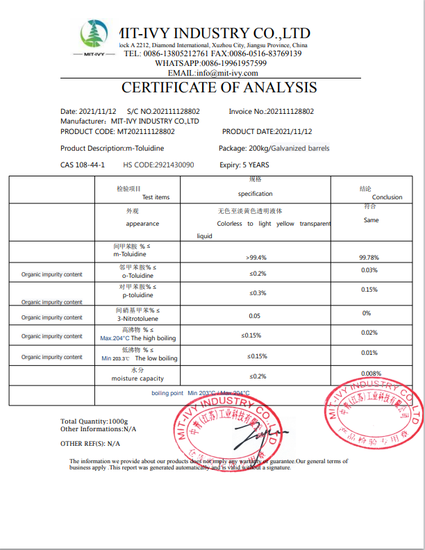 | Product:间甲苯胺-M-Toluidine MT | CAS:108-44-1 | Inspect Date:2024.07.06 | Production Date:2024.07.06 |