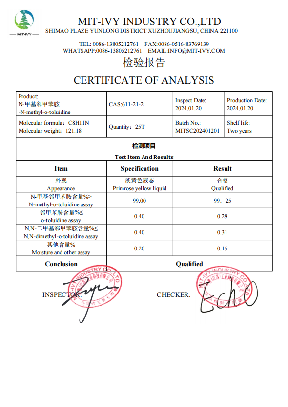 | Product:N-甲基邻甲苯胺-N-methyl-o-toluidine | CAS:611-21-2 | Inspect Date:2024.07.06 | Production Date:2024.07.06 |