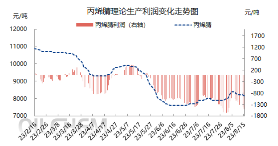 Recently, acrylonitrile production of the main raw materials propylene and synthetic ammonia prices have risen, the current Shandong market propylene price reached 6775 yuan/ton, synthetic ammonia price to 3105 yuan/ton, according to the product consumption theory calculation, acrylonitrile production only raw material cost is: 1.05* propylene +0.5* synthetic ammonia =8666 yuan/ton, excluding labor and processing costs. The market price of acrylonitrile has fallen recently, and the mainstream price of the East China market has dropped from 8400 yuan/ton to 8100 yuan/ton in the past week, and the acrylonitrile single product loss situation has increased, as shown in the figure below.