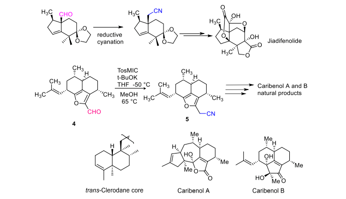 In the synthesis of natural products, the green tosmic is used as a cyanide reagent to easily convert sterically hindered aldehydes into nitriles. This method is further used to introduce an additional carbon atom into aldehydes and ketones. This method has constructive significance in the Enantiospecific total synthesis of jiadifenolide and is a key step in the synthesis of natural products, such as the synthesis of natural products such as clerodane, caribenol A and caribenol B [6] (Figure 5).