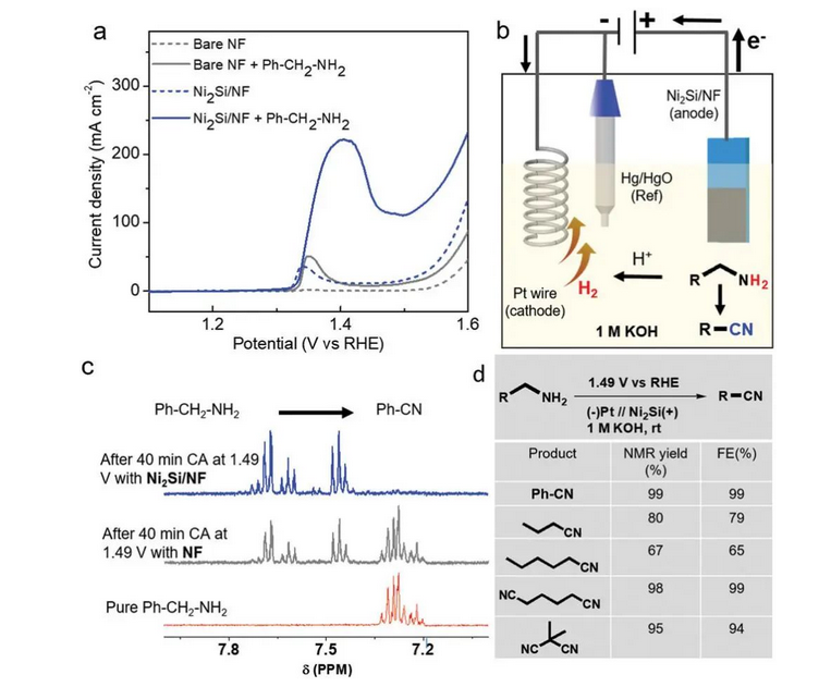 As a green synthesis technology, organic electrochemical synthesis has been widely used in various fields of organic synthesis. In recent years, more and more researchers have paid attention to it. PrashanthW. Menezes team [7] recently reported that aromatic amine or aliphatic amine can be directly oxidized to corresponding cyano compounds in 1m KOH solution (without adding cyanide reagent) with a constant potential of 1.49vrhe using cheap Ni2Si catalyst, with high yield (Figure 6).