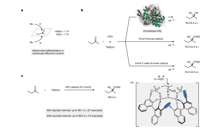 Recently, Benjamin list team [5] reported in the journal Nature the enantiomeric differentiation of 2-butanone (Figure 4a) and the asymmetric cyanide reaction of 2-butanone with enzymes, organic catalysts and transition metal catalysts, using HCN or tmscn as cyanide reagent (Figure 4b). With tmscn as the cyanide reagent, 2-butanone and a wide range of other ketones were subjected to highly enantioselective silyl cyanide reactions under the catalytic conditions of idpi (Figure 4C).