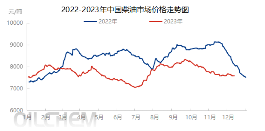 In 2023, China’s diesel market price volatility, two significant increases have risen in expectations, rather than the peak season, as of December 11, the diesel market price of 7590 yuan/ton, up 0.9% from the beginning of the year, down 5.85% year-on-year, the average annual price of 7440 yuan/ton, down 8.3% year-on-year. Since the beginning of this year, the average annual Brent price of 82.42 US dollars/barrel, down 17.57%, the decline of crude oil is significantly higher than that of diesel, and the supply and demand side supports the price of diesel better than crude oil.