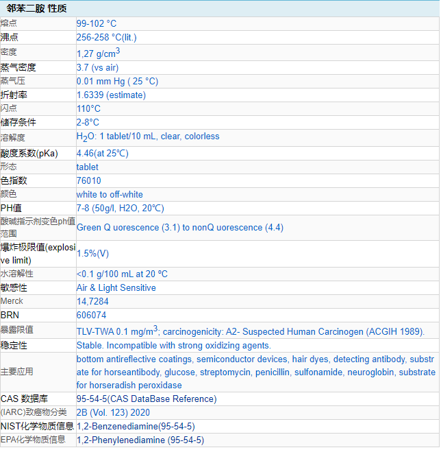 7) Verify nickel and niobium, and determine selenium by spectrophotometry. Verification of vanadium. Separate ozone from nitrogen oxides and hydrogen peroxide. Used to distinguish nitrous acid, hydrogen peroxide and ozone. Fluorescent indicator for acid-base titration (green fluorescence for pH≦3.1, fluorescence disappearance for pH≧4.4) chelating precipitation agent. reducing agent. O-Phenylenediamine is a peroxidase substrate suitable for ELISA enzyme-linked reactions. The substrate produces a soluble end product, orange-brown in color, which can be read by a spectrophotometer at 450nm. The OPD reaction can be stopped with 3NHCl or 3MH2SO4 and read at 492nm.