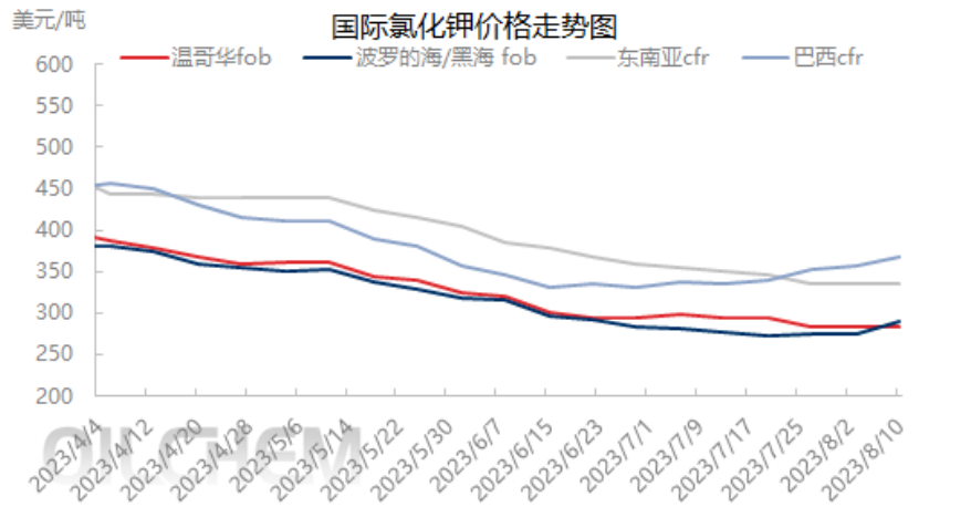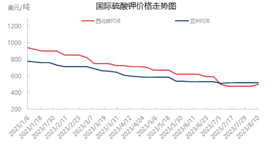 On the other hand, look at the international potassium sulfate market trend, from the price point of view, the main northwest Europe and Asia potassium sulfate market prices gradually stabilized, did not continue to fall, and even northwest Europe potassium sulfate FOB last week appeared to increase the trend of recovery, while Asia potassium sulfate FOB in nearly a month to maintain a relatively stable situation.