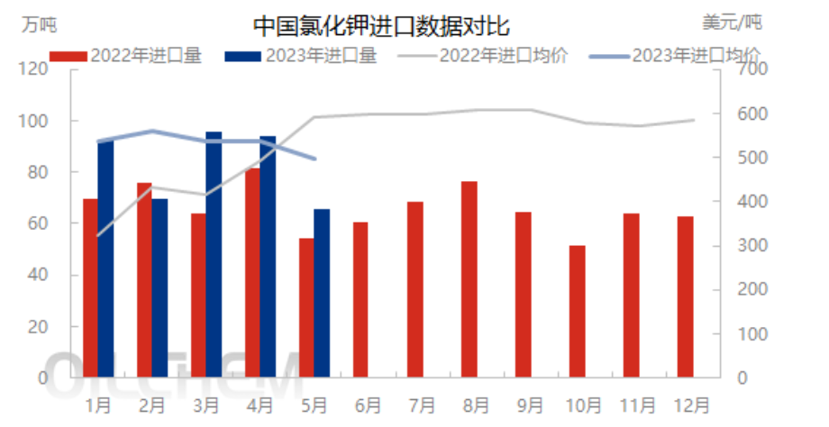 From the latest customs data, China’s potassium chloride imports in May in 659,200 tons, a decrease of 29.85%, the average import price of 496.79 US dollars/ton, 2023 January to May China’s total imports of potassium chloride in 4.171,600 tons, an increase of 20.73%.