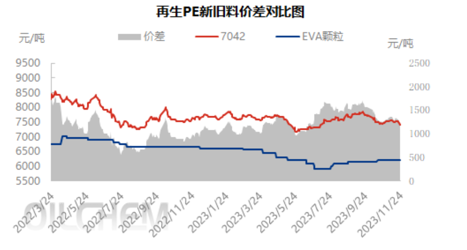 PE prices of new materials continue to decline, the price difference between new and old materials continues to narrow, as of November 24, the price difference between new and old materials has fallen out of 1200 yuan/ton, and under the macro negative pressure, the price difference between new and old materials will continue to narrow, further suppress the flow of recycled particles.