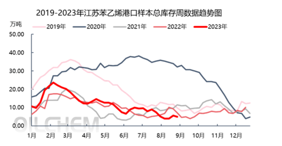 As of September 4, 2023, the total sample inventory of Jiangsu styrene port: 50,200 tons, a decrease of 187,000 tons from the inventory peak of the year, a decrease of 78.84%. According to the data, the port inventory is at a low level in recent years, and according to the shipping schedule tracking of Longzhong Information, the recent port inventory is narrow and volatile, and there is no significant inventory expectation.