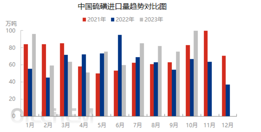 According to the data of the General Administration of Customs, China’s sulfur imports in October 2023 were 997,300 tons, an increase of 32.70% from the previous month and 49.14% from the same period last year; From January to October, China’s cumulative sulfur imports reached 7,460,900 tons, up 12.20% year on year. So far, relying on the good advantages accumulated in the first three quarters and the strength of the import data in October, China’s cumulative sulfur imports as of October this year were only 186,400 tons less than the total imports of the whole year last year. In the context of two months of data remaining, China’s total sulfur imports this year will be more than last year, and is expected to reach the level of 2020 and 2021.