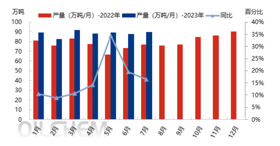 In the figure above, the output of sulfur samples in the state of the country in July 2023 was about 89.38 million tons, a month-on-month increase of 2.22%, with a year-on-year increase of 16.46percent. The increase of the month-on-month increase: the increase of natural days in July, and the increase of individual refinery devices; The reason for the year-on-year increase: the release of new devices.